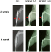 Fig. 3 shows the x-ray photographs of the tibia bone graft fragment that was sacrificed at the 2nd and 4thweek after surgery. In the control group, the bone ends of the graft were sharp and without obvious callus formation after 2 weeks of surgery. Both SPEMF-treated groups showed better treatment effect than the control. At the 2nd week, we could observe bridging callus formations over the posterior aspect of the tibia and only a slight radiolucent gap over the anterior tibia portion (red arrows). At the 4thweek, all of the bone ends united completely, and we did not observe any difference between the SPEMF 1–7 and SPEMF 1–25 groups.