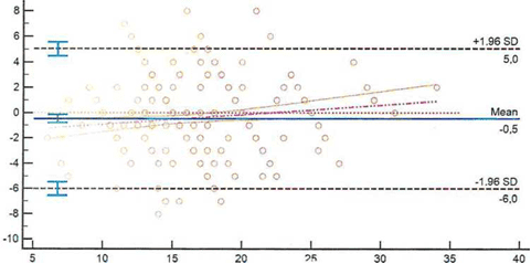 The comparability of the measurements taken with EASYTON and with the palpation method was analyzed using the Bland–Altman plot.